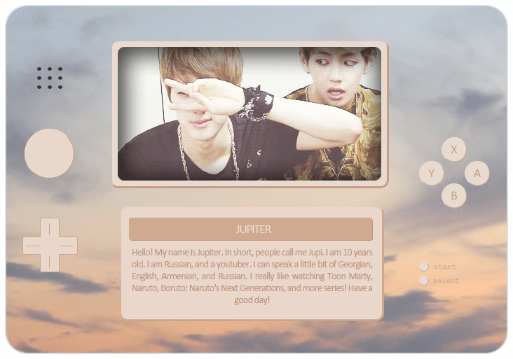 Hi! My name is Jupiter, in short : Jupi. I am 10 years old. I am an Russian, and an youtuber. I speak little bit of Georgia, English, Armenia, Russan. I really like watching Toon Marty, Naruto, Boruto : Naruto's Next Generations, & more series!