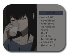 text; visitor, -eats 24/7 -seventeen/seokmin -webtoons -obnoxious -weird -loud -studies canine anatomy/terminology -knows html coding -knows basic coding formats -codes lol